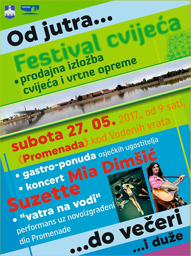 Grad Osijek i gradska Turistička zajednica pozivaju Vas na Festival cvijeća, koji će se održati na Promenadi uz rijeku Dravu kod Vodenih vrata - gradskih zidina, u subotu 27. svibnja 2017. od prijepodnevnih do večernjih sati.