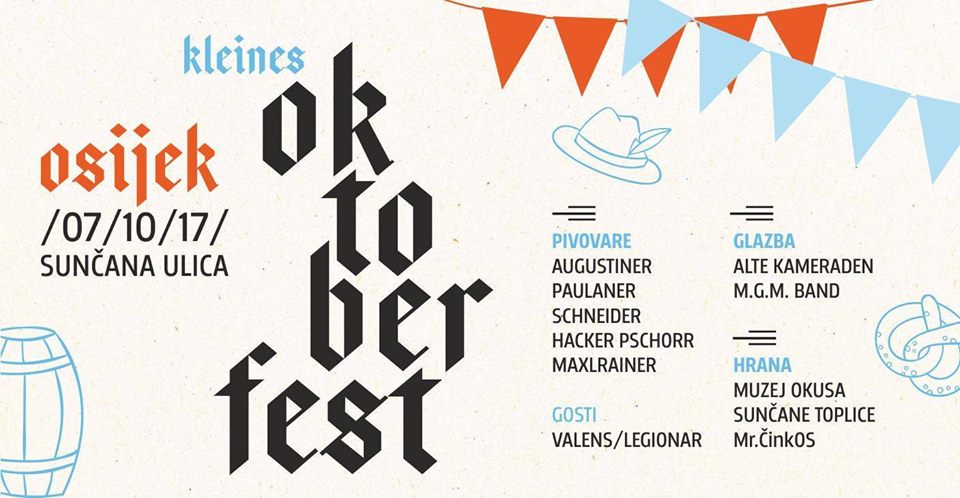 Kod kušaonice piva Gajba u Sunčanoj ulici, u subotu 7.10.2017, od 15:00 do 23:00 sata čeka vas jedna od najvećih pučkih zabava ove godine u gradu na Dravi! Ponos bavarske prijestolnice, izvrsno pivo, zvuci, mirisi i okusi prošarat će Sunčanu ulicu u osječkom Gornjem gradu (centar) na manifestaciji Kleines Oktoberfest (Mali Oktoberfest).