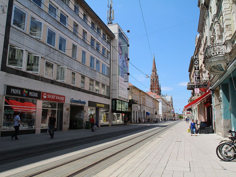 Ulice koje se granaju od glavnog trga, Kapucinska ulica (Korzo), Županijska i Strossmayerova ulica te Ulica Hrvatske Republike čine trgovački centar Osijeka u kojima ćete pronaći sve što biste pronašli i u jednome od velikih trgovačkih centara: trgovine odjećom i obućom, specijalizirane i uslužne obrtničke radnje, trgovine tehničkom robom, zlatarnice, cvjećarnice, ljekarne, knjižare, pekarnice, restorane, slastičarnice i kavane, suvenirnice, poštanske urede, banke, poslovnice tele operatera i druge. Ponudu „trgovačkog centra na otvorenom“ upotpunjuju i obližnji povijesni kinematografi Europa i Urania.