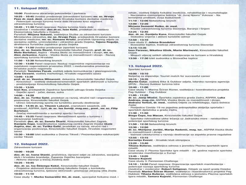 U tri dana sudionici će imati prilike prisustvovati i potaknuti argumentirane rasprave putem tri panela, slušati desetke predavanja te učiti iz radionica i razmjene mišljenja stručnjaka kako bi se istaknuli potencijali sportskog i zdravstvenog turizma. Budući da je segment sportskog i zdravstvenog turizma na svojim početcima i u svijetu, ovi atraktivni oblici turizma imaju jednaku mogućnost razvoja širom Hrvatske, na što će skup i ukazati. Organizirana je nagradna igra u okviru koje se dodjeljuju dvije vrijedne stipendije (sportski i turistički menadžment), a pripremljene su tri panel rasprave na teme sportskog menadžmenta u turizmu, organizaciji sportskih manifestacija i potencijalu promocije putem istih.