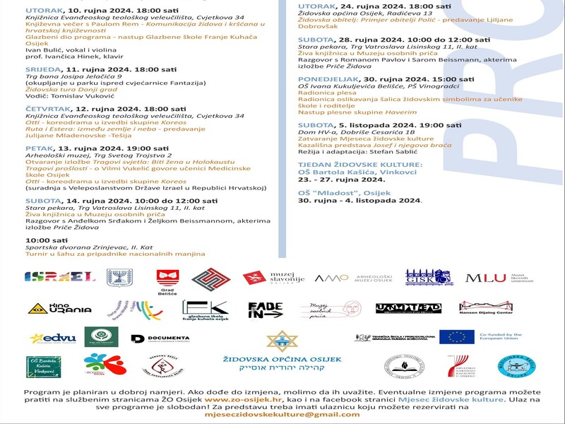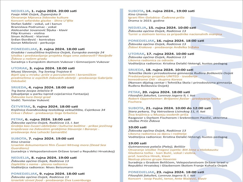 U današnjem svijetu židovske obitelji suočavaju se s osjetljivom ravnotežom očuvanja baštine uz prilagodbu zahtjevima modernog života. Štoviše, evoluirajuća uloga žena unutar židovskih obitelji, prijelaz s tradicionalnih na inkluzivnije položaje, dodaje fascinantnu dimenziju raspravi. Osim krvnog srodstva, koncept odabrane obitelji i blisko povezane zajednice kao proširene obitelji vitalni su aspekti europske židovske kulture. Ova dimenzija također pruža priliku za razmišljanje o povijesnim događajima koji su duboko oblikovali razumijevanje obitelji unutar europskih židovskih zajednica, kao što su Holokaust i židovska dijaspora. Upravo ova zajednička tema odabrana je jer nudi sveobuhvatnu perspektivu o značaju obitelji u europskoj židovskoj kulturi, premošćujući tradiciju prošlosti s dinamikom sadašnjosti i budućnosti. Židovska općina Osijek će tijekom Mjeseca židovske kulture građanima Osijeka ponuditi mnoštvo sadržaja: od koncerata, izložbi, različitih predavanja, likovnih i plesnih radionica, sportskih događanja, scenskih izvedbi, filmova, vođenih šetnji, živih knjižnica, književne večeri. U program su uključene mnoge osječke kulturne i druge institucije, a dio programa odvijat će se u Belišću i Vinkovcima.