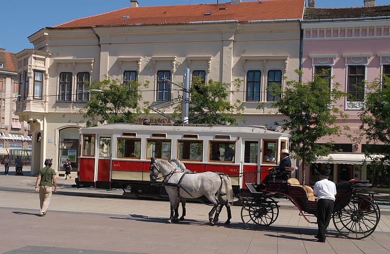 Dana 10. rujna 1884. u Osijeku je počeo prometovati konjski tramvaj, jedan od prvih u srednjoj i jugoistočnoj Europi. Od većih gradova u regiji jedino su Beč, Budimpešta, Graz i Bukurešt tramvaj dobili prije Osijeka dok su ga gradovi Zagreb, Bratislava, Sofia i Beograd uveli kasnije. Unatoč velikim željama da prestignu Osječane, u Sarajevu je tramvaj zakasnio tri mjeseca. Mnogi gradovi svijeta danas ponovo uvode tramvaje u sustav javnog prijevoza, a Osijek je među rijetkim "malim" gradovima koji se mogu pohvaliti njegovim neprekinutim postojanjem i proširenjem. Na osječkim se ulicama trenutno može vidjeti četiri različita modela tramvaja od kojih je najstariji onaj iz 1926. godine te služi za turističke vožnje gradom. Zanimljivo je kako je prvi tramvaj iz 1884. bio crvene boje, navodno po želji cara Franje Josipa kako bi sličio bečkim tramvajima. Danas su tramvaji bijelo - plavi, u gradskim bojama. (Fotografija, autor: Damir Macanić)