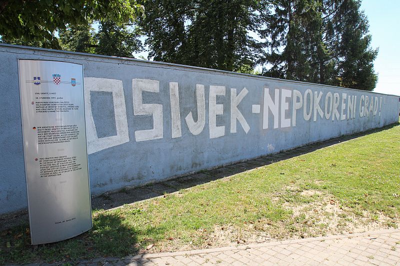 U vrijeme najvećih oružanih napada na Osijek, kada se Hrvatska u ratu branila od komunističke Jugoslavije, dan nakon okupacije Vukovara 18. studenog 1991., snažnu poruku ponosa i prkosa na zid na rubu grada upisao je pokojni branitelj Predrag Sušac. Osijek je zahvaljujući hrabrim vojnicima i sugrađanima ostao „nepokoreni grad“. Grafit je zaštićeno kulturno dobro.