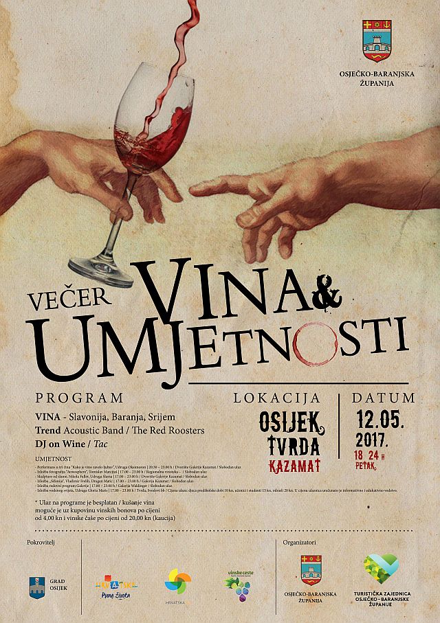 U subotu 12. svibnja, od 18 sati do ponoći, u gradskim zidinama u Tvrđi (Kazamat/Vodena Vrata) održat će se tradicionalna manifestacija "Večer vina i umjetnosti", dio događanja Dani vina i turizma 2017.
