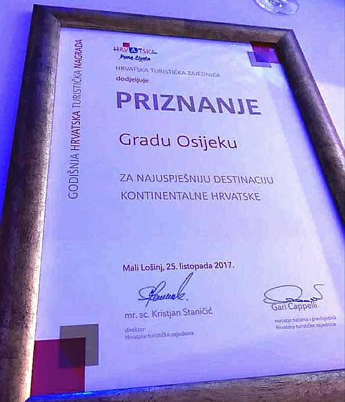 Dan nakon primitka ove prestižne turističke nagrade koja nas je zaista razveselila, zahvaljujemo još jednom svima koji su joj pridonijeli. To su svakako ostali turistički djelatnici, agenti koji nam dovode grupe turista autobusima i riječnim cruiserima, vodiči koji su turistima često „prvi Osječani“ s kojima se susreću te tako stvaraju prvi dojam o nama ostalima, vlasnici smještajnih objekata i restorana među kojima su i oni već proglašeni najboljima u Hrvatskoj, trgovci, organizatori zanimljivih manifestacija i djelatnici u gradskim javnim službama poput vozača tramvaja i autobusa čija uslužnost i osmjeh pri kupnji karte ostaje u sjećanju svakom turistu. Možda i nesvjesni da pridonose lijepoj turističkoj slici grada, za nagradu su zaslužni i vozači automobila koji redovito propuste pješake na prijelazima (vjerujte nam, to je jedan od „detalja“ koji turisti prvog primijete u Osijeku, jer je u mnogim drugim gradovima to iznimka!), djelatnici u sportu, kulturi, zabavi, djelatnici Unikoma koji brinu za čistoću grada i urednost parkova, pa i svi sugrađani koji brinu o svojim uređenim okućnicama i predvrtovima.